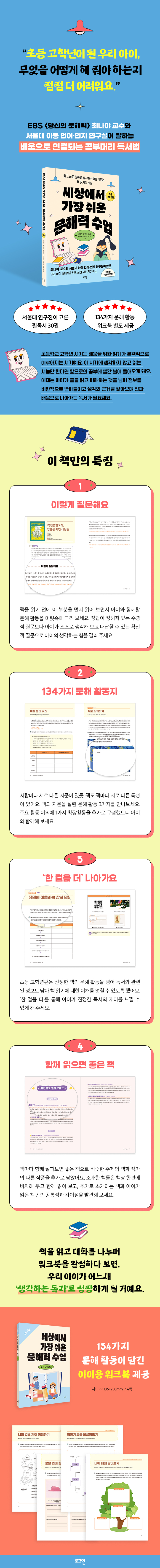 초등학교 고학년 시기는 배움을 위한 읽기가 본격적으로 이루어지는 시기다. 이 시기에 생각하지 않고 읽는 시늉만 한다면 앞으로의 공부에 빨간 불이 들어오게 된다. 『세상에서 가장 쉬운 문해력 수업』 시리즈의 마지막인 이 책은 초등학교 4~6학년을 대상으로 읽기·사고·표현 능력을 통합적으로 키울 수 있도록 설계했다. 단순히 글을 읽는 수준에 그치지 않고, 생각을 깊이 탐구하는 질문과 활동을 통해 비판적 사고를 자연스럽게 끌어낸다. 아이가 직접 해 볼 수 있는 다양한 문해 활동지를 제공함으로써 문해력을 실제로 활용할 수 있는 힘으로 전환할 수 있도록 돕는다.
