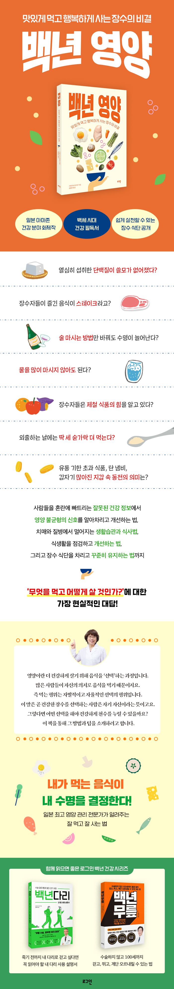 이렇듯 쉬워 보이지만 절대 쉽지 않은 식습관을 형성하고 꾸준히 실천하는 데 있어 이 책 『백년 영양』은 맞춤 정보를 제공한다. 특별한 질환은 없지만 지금의 건강을 유지하고 싶어 하는 사람에게는 좀 더 효과적이고 효율적으로 영양을 섭취 흡수할 수 있는 방법을, 질병에 걸려 ‘먹는 기능’에 문제가 생긴 사람에게는 좀 더 빠른 회복을 돕고 건강을 개선할 수 있는 팁을, 그리고 아픈 환자를 돌봐야 하는 가족에게는 증상별 추천 음식과 조리법 등 실질적으로 도움을 줄 수 있는 정보를 제공한다.