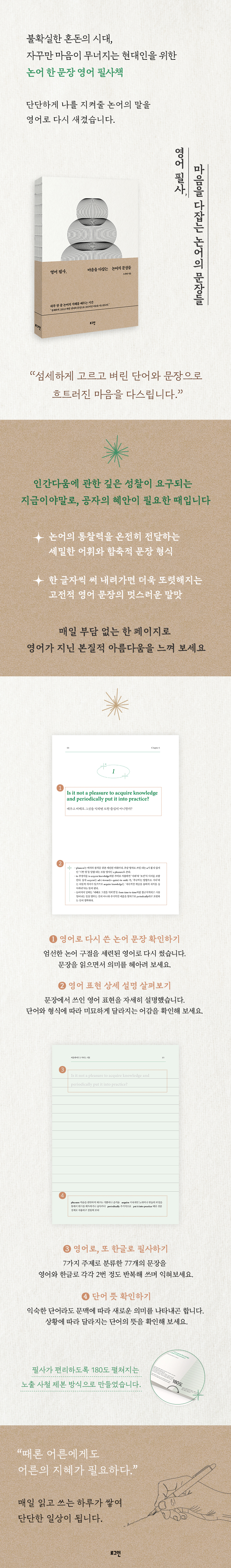각박한 일상을 살아가는 우리는 하루에도 몇 번씩 마음이 꺾인다. 그렇게 마음이 무너질 때면 내면을 찬찬히 살펴보는 혼자만의 시간이 필요하다. 이 책은 2,500년이라는 긴 시간, 변함없이 삶의 지혜를 전해 온 논어의 문장으로 이러한 자기 성찰의 시간을 스스로 발견할 수 있도록 했다. 굳건한 성인의 말을 한 글자, 한 글자 적다 보면 어느새 번잡했던 마음이 차분하게 가라앉고 마음의 상처가 치유되는 경험을 하게 된다. 한글과 영어를 모두 필사하도록 권하는 이유이기도 하다.